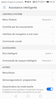 Notez que l'intégration du lecteur d'empreinte comme pavé tactile n'entraîne pas la suppression du menu flottant qui sert à améliorer l'expérience à une main du téléphone (en positionnant ce bouton virtuel à proximité du pouce). Il est toujours accessible depuis le menu des paramètres (rubrique « Assistance intelligente » où se trouvent aussi les contrôles par mouvement, les commandes vocales et même le « mode gant ») ou par le biais de la zone de paramétrage rapide. Notez aussi que Swiftkey est toujours le fournisseur de clavier intelligent de Huawei.