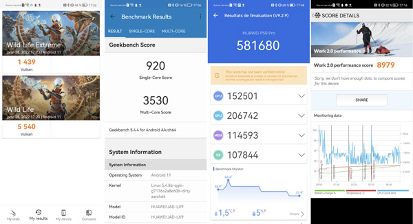Le P50 Pro est équipé, comme cela était évoqué plus haut, d'un chipset Qualcomm Snapdragon 888 en version 4G, comme le P50 Pocket. Il est associé à 8 Go de mémoire vive ce qui est suffisant pour proposer une expérience fluide et très agréable au quotidien. Aucun ralentissement n'a été constaté pendant notre phase de test et nous avons pu passer d'une application à une autre en un instant. Comme son cousin pliant, les performances brutes sont en deçà de celles proposées par la version 5G du processeur. Toutefois, ces résultats sont à relativiser, car, encore une fois, le mobile est très fluide et exécute les applications avec une vélocité certaine. Les jeux ne sont pas un problème pour lui. Notez également que même lorsqu'il est soumis à rudes épreuves pendant une phase assez longue de test, l'appareil reste à une température supportable.
