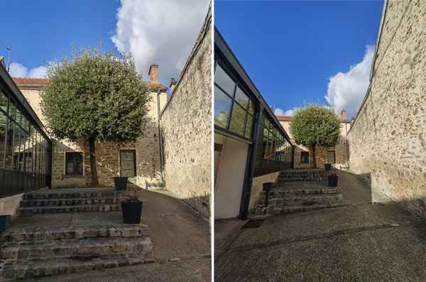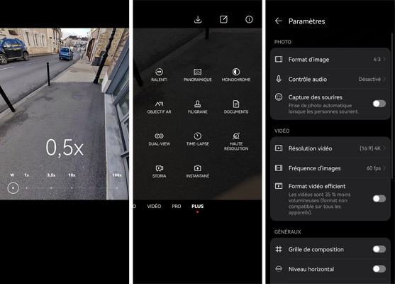 L'interface de l'application Appareil photo est classique avec les principales options en haut de l?écran, la fenêtre de cadrage, les niveaux de zoom, les modes de prises de vue et le bouton de déclenchement qui est encadré par l'aperçu de la dernière photo prise et l'option pour passer en mode selfie depuis le capteur frontal. Celui-ci dispose de 13 mégapixels. Notez la possibilité de personnaliser l'interface en ajoutant certains modes du menu Plus à côté des autres pour y accéder plus rapidement.