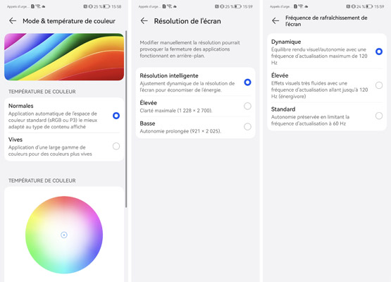 On apprécie la fréquence de rafraîchissement de 120 Hz ainsi que le taux d?échantillonnage de 300 Hz, pratique pour les jeux vidéo et le défilement des pages. La fréquence peut être bloquée sur 60, 120 Hz ou on peut opter pour le mode dynamique auquel cas, c'est le smartphone qui adapte automatiquement la fréquence selon l'application utilisée et ainsi optimiser la consommation de la batterie. On peut faire de même avec la définition de l?écran : opter pour une définition dite intelligente, élevée (1228x2700) ou basse (921x2025). Notez également que des options sont présentes pour ajuster le rendu de l?écran et notamment la température des couleurs avec un mode vif ou normal. La luminosité offerte par l?écran est tout à fait satisfaisante et permet un usage même en extérieur en plein soleil. En cas d'obscurité, la luminosité s'adapte parfaitement pour ne pas abîmer les yeux.