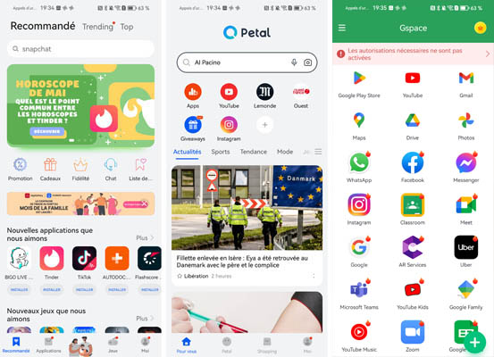 L’application GSpace permet de passer outre le Google Play Store et d’installer des applications Google sur le mobile. Avant, il fallait passer par les versions web des services et créer des raccourcis sur la page d’accueil pour y accéder rapidement, ce qui est toujours possible, d’ailleurs. Avec GSpace, les applications Google sont disponibles, comme sur n’importe quel autre mobile sous Android. Cet espace virtualisé donne ainsi accès au Google Play Store et aux applications du géant américain. Toutefois, il peut aussi ne pas suffire pour certains services et certains jeux. GSpace a été approuvé par Huawei et peut même gérer les mises à jour des différentes applications lorsqu’elles sont disponibles. Le hic, c’est pour les notifications qui sont passées sous silence la plupart du temps.