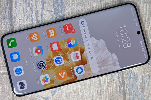 Le P60 Pro utilise un écran qui s’appuie sur une dalle AMOLED flexible d’une diagonale de 6,67 pouces affichant une définition maximale de 1220x2700 pixels offrant ainsi une excellente lisibilité. Il a la particularité d’être incurvé sur les 4 côtés, comme le Huawei P40 Pro, le Motorola edge40 Pro, les Magic4 Pro et Magic5 Pro de Honor. C’est vraiment agréable au quotidien, car cela permet d’offrir une excellente ergonomie notamment pour les gestes de navigation dans les différents menus. En outre, cela aide également à avoir un beau design. Huawei ne communique pas sur le pic de luminosité. Nous avons pu le tester dans différentes conditions d’éclairage dont une après-midi en plein soleil et nous n’avons jamais rencontré de souci. L’écran s’est toujours proposé avec une belle luminosité, suffisante, et sans provoquer de fatigue oculaire particulière. Dans les paramètres, il est possible d’activer une fonction qui réduit la lumière bleue émise par l’écran, définir le niveau du filtre et proposer une réduction du scintillement, le cas échéant. On peut compter sur une fréquence de rafraîchissement variable jusqu’à 120 Hz et effectivement, les défilements paraissent très fluides. Il est possible de choisir entre les modes Dynamique (équilibre entre fluidité et consommation), Elevée (privilégiant la fluidité au détriment de la consommation) ou Standard (pour une autonomie préservée). Il est possible de modifier la définition de l’écran soit automatiquement ou la bloquer sur 1220x2700 ou 854x1890 pixels.