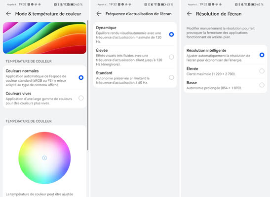 Il y a plusieurs options pour changer le mode des couleurs de l’écran : couleurs normales ou vives. On peut également jouer sur la température des couleurs pour donner une teinte plus froide ou plus chaude.
