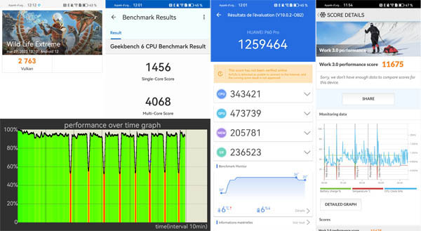 Comme les autres mobiles que nous avons pu tester, nous avons soumis le P60 Pro a plusieurs outils de mesure de performances dont voici les principaux résultats. On peut remarquer que le chipset donne tout son potentiel pendant presque les 20 premières minutes puis, à intervalles réguliers, accuse une chute de performances descendant jusqu’à 50% environ.