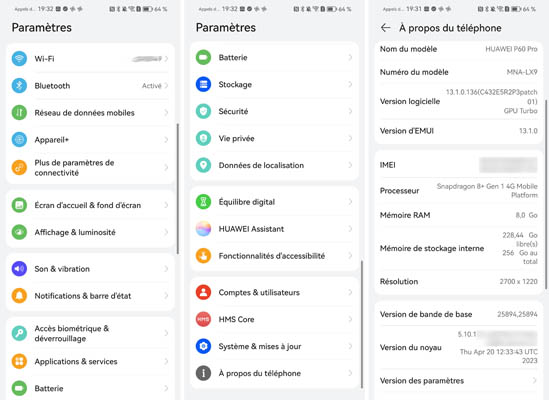 - Système d’exploitation : Android Open Source HarmonyOS avec une surcouche logicielle EMUI