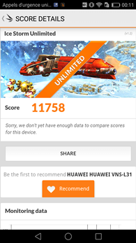 La capture d'écran ci-dessus montre Dead Trigger 2 avec le profil graphique le plus élevé, et il tournait plutôt bien ainsi sur le P9 Lite. Quelques (très) légers ralentissements ci et là mais pas de quoi gâcher le plaisir de jeu. Inutile de dire qu'après ça, Angry Birds Go! est passé comme une lettre à la poste ! Comme quoi, le Mali-T830 d'ARM qui épaule le Kirin 650 en a tout de même dans le ventre. Vous devriez pouvoir jouer à tous les jeux disponibles sur le Play Store même s'il faudra peut-être passer sur des graphismes moins détaillés sur les soft les plus gourmands.