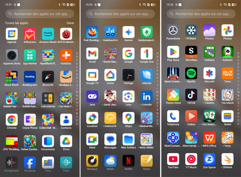 Comptez donc sur la présence, à l’ouverture des applications suivantes : AliExpress, Amazon Music, App Market, AquaBlocks Puzzle Seas, AutoDoc, Block Blast!, Booking.com, Boutique Amazon, Bubble Pop ! Shooter Puzzle, Bubble Rainbow, Car Mods Factory – Match 3, Collect Ball – Match Em All, Defeat Zombie : Defense Strategy, Fruit Shooting – Sharp Knife, Goods Master 3D, Junes’s Journey, LinkedIn, Medical Master, Mots Mêlés, Netflix, ShortMax, Solitaire, Space Cruises Shooting Game, Spotify. Il y a aussi Temu, TikTok, Tle Match, Tiledom, Vita Mahjong, Word Connect Wonders Of View, Worm Family – Eat Em All, WPS Office et Yatzy.