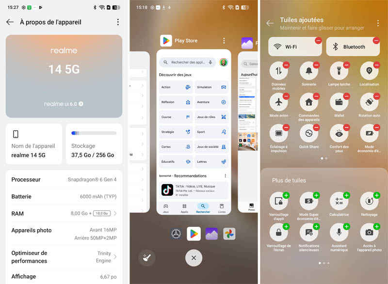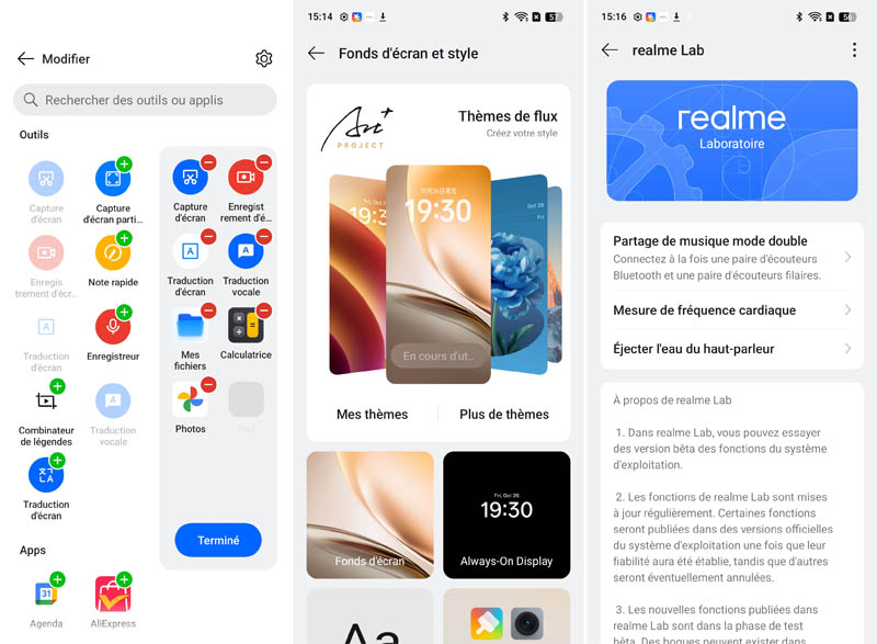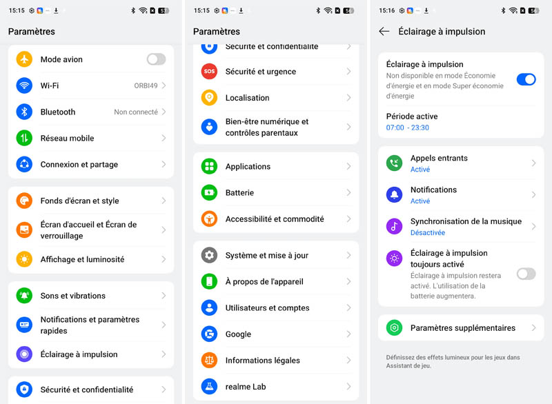 L'interface realme UI 6.0 offre de nombreuses possibilités de personnalisation : thèmes, icônes, animations, toujours-affiché et widgets. Le niveau de customisation rivalise avec celui des interfaces concurrentes comme MIUI de Xiaomi ou One UI de Samsung. Les paramètres sont logiquement organisés en catégories claires, facilitant l'accès aux fonctions recherchées.