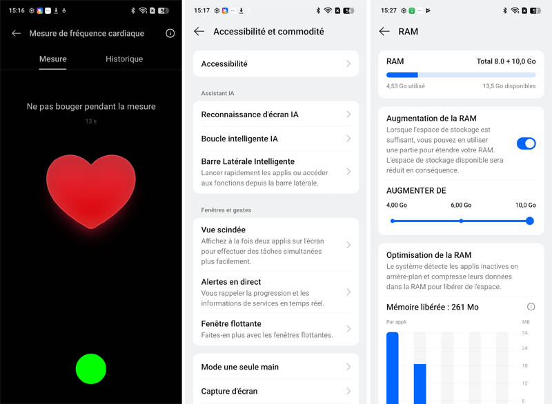 Le lecteur d'empreintes digitales optique sous l'écran répond correctement aux sollicitations, avec un temps de reconnaissance très satisfaisant. Sa position centrale facilite l'accès aussi bien pour les droitiers que les gauchers, et sa réactivité s'avère agréable dans la majorité des situations, même avec les doigts légèrement humides. Notez qu’il est possible de lui faire mesurer votre fréquence cardiaque, via le menu correspondant dans les paramètres. Dommage que la marque n’offre pas une application dédiée, plus facile et plus rapide à utiliser. Seul reproche concernant le lecteur, il est situé à seulement 1 cm du bord inférieur, ce qui est trop bas, selon nous. Nous préférons un emplacement un peu plus haut, pour une meilleure ergonomie.