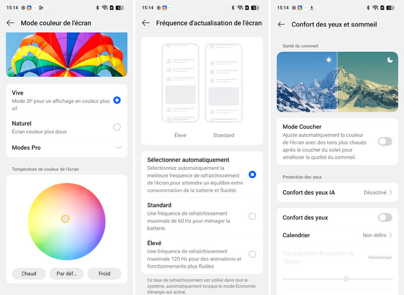 Les options de personnalisation de l'écran s'avèrent complètes avec plusieurs profils colorimétriques disponibles : Vive, Naturel et Pro. Le mode Naturel privilégie la fidélité des couleurs, tandis que le mode Éclatant sature davantage les teintes pour un rendu plus punchy. Le mode Pro permet un réglage fin de la température de couleur selon les préférences personnelles. La fonction de protection oculaire adapte automatiquement la température selon l'heure, réduisant la fatigue visuelle en soirée.
