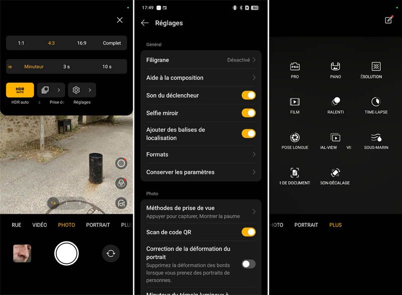 L'interface de l'application appareil photo adopte une approche simple et efficace avec les modes essentiels directement accessibles : Nuit, Rue, Vidéo, Photo, Portrait et Plus. Les niveaux de zoom 1x, 2x et 5x (numérique) sont proposés via des boutons dédiés, facilitant le cadrage selon les situations. Les options avancées restent accessibles via un menu déroulant sans encombrer l'interface principale. Le menu Plus permet d’accéder à d’autres modes de prises de vue : Pro, Pano(ramique), Haute Résolution, Film, Ralenti, Time-Lapse, Pose Longue, Vidéo Dual-View, Sous-marin, Scanner de document et inclinaison.