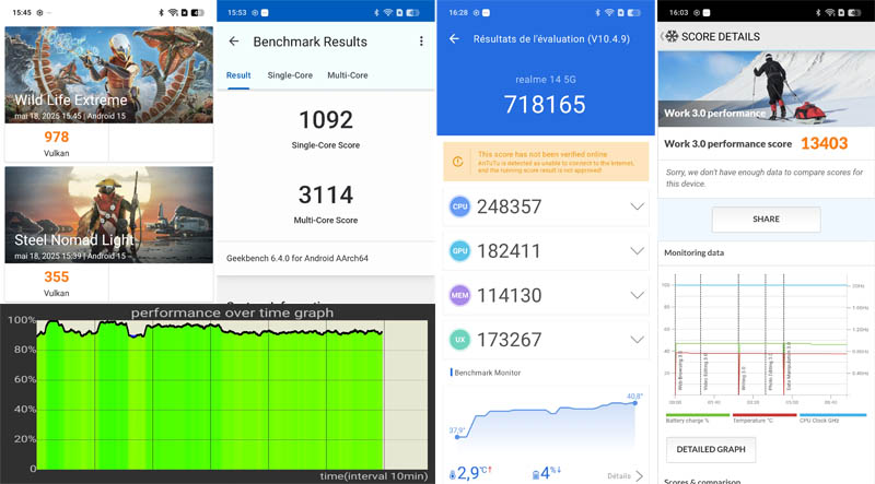 En termes de performances brutes, le Snapdragon 6 Gen 4 se place dans la moyenne de sa catégorie, derrière les Dimensity 7050 du Honor Magic6 Lite ou le Snapdragon 7s Gen 2 du Nothing Phone (2a). Selon notre test, les scores de benchmark positionnent le realme 14 5G légèrement en retrait face aux concurrents les plus performants, mais les différences restent peu perceptibles en usage quotidien.