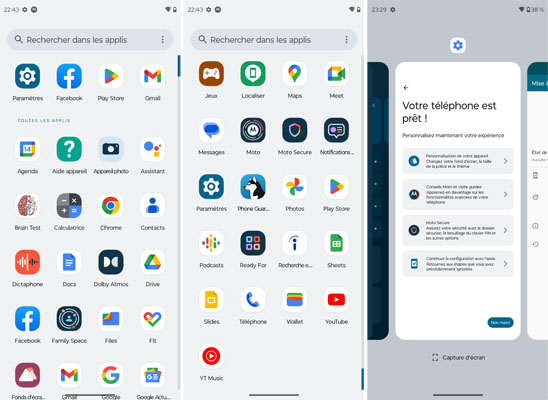 Le Motorola edge40 Pro est animé par Android 13 avec une surcouche logicielle développée par Motorola et que l’on trouve également sur les autres mobiles de la marque dont le Motorola g53 ou le pliant Motorola Razr 2022, que nous avons testé, par exemple. Il s’agit d’une interface qui est similaire à Android Stock, c’est-à-dire comme les mobiles Google Pixel. Toutes les applications du géant américain y sont disponibles. En plus, il y a l’application Brain Test, Dolby Atmos, Family Space, Moto, Phone Guard et Ready For. Rappelons que cette dernière permet de s’interfacer à un moniteur pour profiter d’une interface graphique adaptée pour travailler plus efficacement. Les options de personnalisation sont très nombreuses. La mise à jour de sécurité datait du 1er février 2023, ce qui relativement récent, le test s’étant déroulé fin avril, début mai. La mise à jour du système Google Play datait du 1er avril 2023. Motorola promet 3 ans de mises à jour Android et 4 ans de mises à jour de sécurité, ce qui laisse de quoi voir venir.