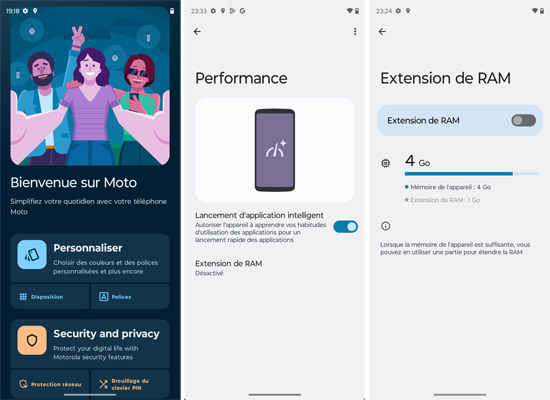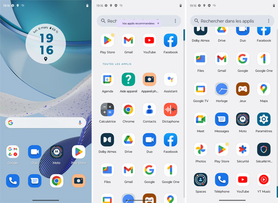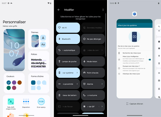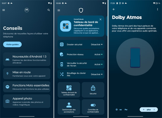 Le Motorola g53 est animé par Android 13 avec une surcouche logicielle développée par Motorola et que l’on trouve également sur les autres mobiles de la marque dont le récent Motorola Razr 2022, par exemple. Il s’agit d’une interface qui est similaire à Android Stock, c’est-à-dire comme les mobiles Google. Toutes les applications du géant américain sont disponibles. En plus, il y a l’application AutoDoc, Dolby Atmos, Family Space, Moto, Phone Guard et Pinterest. Il y a plusieurs options de personnalisation. La mise à jour de sécurité datait du 1er janvier 2023, ce qui très récent, le test s’étant déroulé courant février. La mise à jour du système Google Play datait du 1er février 2023.