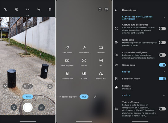 L’application Appareil photo est très classique avec quelques options disponibles en haut de l’écran. En dessous, il y a la zone de cadrage puis les modes Macro et 1x. La fonction Google Lens est immédiatement disponible, ainsi que les filtres . Dessous, il y a les modes Ralenti, Vidéo, Photo, Portrait, Vidéo en double capture et Plus. Dans ce dernier menu, on trouve d’autres modes : Filtre couleur, vision de nuit, panorama, selfie de groupe, ultra-res, Pro, double capture, Accéléré et Filtre couleur (pour les vidéos). Notez la possibilité de personnaliser la barre des modes en y ajoutant l’un de ceux présents dans le menu Plus, afin d’y accéder plus rapidement.