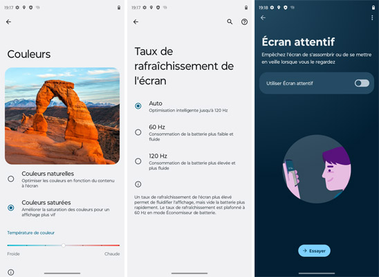 Le Motorola g53 est équipé d’un écran avec une dalle LCD, moins qualitative que les écrans OLED (comme c’est le cas sur le Xiaomi Redmi Note 11 (non compatible 5G). La diagonale est de 6,5 pouces avec une définition de seulement 720x1600 pixels, ce qui est aussi le cas de la concurrence, là aussi, sauf pour le Redmi Note 11 qui propose une meilleure lisibilité pouvant monter jusqu’à 1080x2400 pixels. Toutefois, l’écran du Motorola g53 a l’avantage de proposer une fréquence de rafraîchissement maximale de 120 Hz. La luminosité peut s’adapter aux conditions d’éclairage environnant. Dans les paramètres, il est possible de changer le mode des couleurs pour une teinte plus naturelles ou plus saturées. Notez également la possibilité de jouer sur la température des couleurs pour avoir une teinte plus froide ou plus chaude. Concernant la fréquence de rafraîchissement, on peut la bloquer sur le mode 60 Hz ou 120 Hz, ou dernière option, choisir le mode automatique qui permet au système de gérer la meilleure fréquence pour trouver le bon compromis entre fluidité des défilements et consommation d’énergie. L’écran peut rester actif tant qu’on le regarde et il est possible d’enregistrer ce qui s’y passe.
