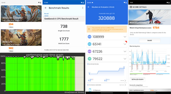 À l’usage, le mobile répond avec une certaine vélocité, mais offre tout de même quelques moments d’attente lorsqu’il s’agit de passer d’une application à une autre ou pour lancer un jeu. Pour cette dernière activité, il ne faut pas s’attendre à pouvoir jouer aux derniers jeux en vogue avec un maximum de détails, ni même avec un minimum. Seuls les jeux casuals trouvent grâce à une jouabilité correcte. Comme pour les autres mobiles, nous l’avons soumis à plusieurs outils de mesure de performances dont voici les principaux résultats. Notez que le processeur est particulièrement stable tout au long de la phase de test durant 60 minutes, ce qui est une bonne chose. Le mobile reste parfaitement tempéré et ne propose aucune surchauffe, même soumis à rude épreuve.