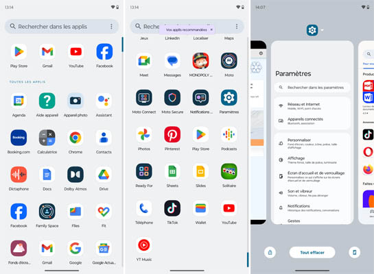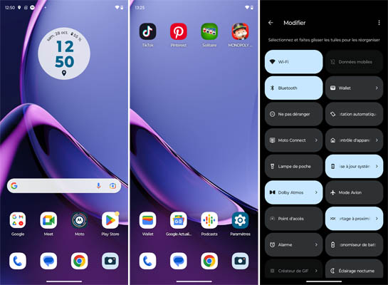 Le Motorola g84 5G est animé par Android 13 avec une surcouche logicielle développée par Motorola et que l’on trouve également sur les autres mobiles de la marque comme le Motorola edge40 Pro, le Motorola edge40 ou le Motorola Razr 40 Ultra, par exemple. Il s’agit d’une interface similaire à Android Stock, c’est-à-dire comme les mobiles Google Pixel. Toutes les applications du géant américain y sont disponibles. En plus, nous avons été étonnés de voir plusieurs applications proposées d’office, ce dont ne nous avait pas habitués la marque. Ainsi, il y a les applications Booking, Dolby Atmos, Facebook, Family Space, LinkedIn, Monopoly, Moto, Ready For, Pinterest, Solitaire et TikTok. Certaines, en plus, sont « poussées » par la marque lors de la phase de configuration. Il est possible de les sélectionner, ou pas.