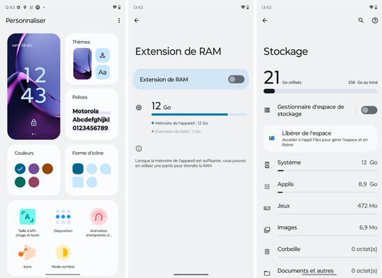 Comptez sur une occupation de 21 Go pour le système sur les 256 Go de mémoire interne contenus sur notre modèle de test. C’est très raisonnable lorsqu’on sait que certains mobiles demandent 60 voire 70 Go occupés pour le système avec la surcouche logicielle, notamment sur certains mobiles Samsung, par exemple.