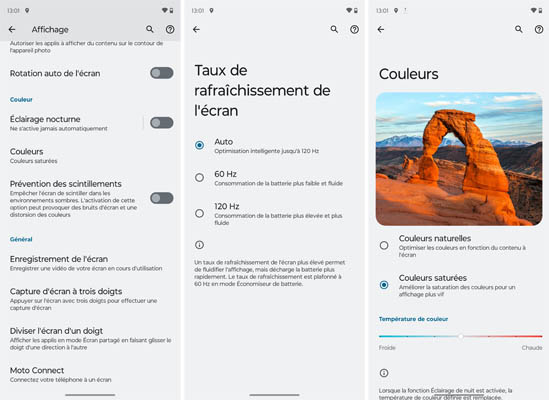 Dans les paramètres, il est possible de choisir entre l’affichage de couleurs saturées ou naturelles. Il est aussi possible de jouer sur la température des couleurs pour obtenir une teinte plus froide ou plus chaude. Concernant la fréquence de rafraîchissement, il est possible de sélectionner le mode le plus adapté à votre utilisation entre Auto (maximum 120 Hz), 60 ou 120 Hz. Rappelons qu’une fréquence élevée consomme plus d’énergie et donc réduit l’autonomie de l’appareil. À contrario, si la fréquence est faible, l’autonomie est plus importante. Sauf pour des usages spécifiques, il est donc conseillé de sélectionner le mode automatique qui va gérer les besoins en fonction des applications en cours d’utilisation et de la consommation d’énergie afin de trouver le meilleur compromis.