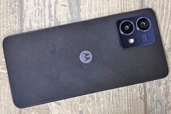 Les objectifs profitent d’un cerclage hachuré qui les met en valeur. Il y a un flash sur le même plan que la plaque qui n'est pas exactement dans le même ton que la couleur du reste du dos du mobile. Celui-ci est décliné en trois coloris : Bleu, Bleu nuit et Viva Magneta, une couleur officielle Pantone aussi utilisée sur d’autres modèles de la marque comme le pliant Razr 40 Ultra ou le edge40, par exemple. C’est la finition Bleu nuit que nous avons reçue en test, un modèle prêté par la marque qui ne souffrait d’aucun défaut de fabrication malgré un examen minutieux. Pour en terminer avec la description de la coque arrière, sachez qu’elle ne laisse aucune empreinte de doigts, ce qui n’est pas si courant.