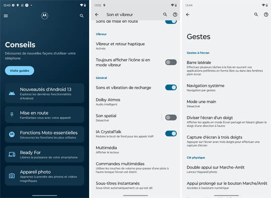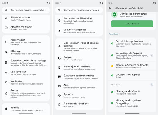 Rappelons que l’application Ready For permet d’interfacer le mobile avec un moniteur pour profiter d’une interface graphique adaptée pour travailler plus efficacement. Les options de personnalisation sont très nombreuses. La mise à jour de sécurité datait du 1er août 2023, ce qui pourrait être plus récent. La mise à jour du système Google Play datait du 1er octobre 2023, ce qui est assez récent si on sait que le test a été réalisé fin octobre. Motorola promet 2 ans de mises à jour Android et 3 ans de mises à jour de sécurité. Xiaomi et Samsung proposent des suivis un peu plus longs sans parler de Google qui promet 7 ans de mises à jour pour le système et la sécurité.