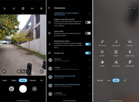 Exactement comme sur le Motorola edge 40 Neo, la fonction Google Lens est immédiatement disponible, à gauche, ainsi que les filtres, à droite. Dessous, il y a les modes Ralenti, Vidéo, Photo, Portrait, Pro et Plus. Dans ce dernier menu, on trouve d’autres modes : Filtre couleur, Vision de nuit, Panorama, Ultra-res (50 mégapixels), scanner, double capture, Accéléré, Filtre couleur (pour les vidéos) et double capture (pour les vidéos).