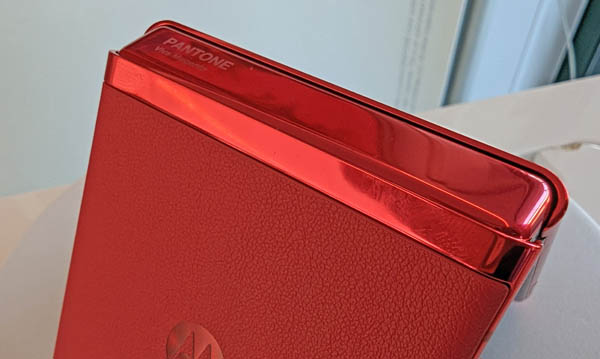 Le Motorola Razr 40 Ultra est décliné en noir, bleu clair ou Viva Magenta, la couleur Pantone de l’année 2023. Cette dernière est particulièrement classe et d’un très bel effet sur un tel appareil. L’arrière du deuxième volet profite d’un revêtement en similicuir avec une légère texture, très agréable au toucher.
