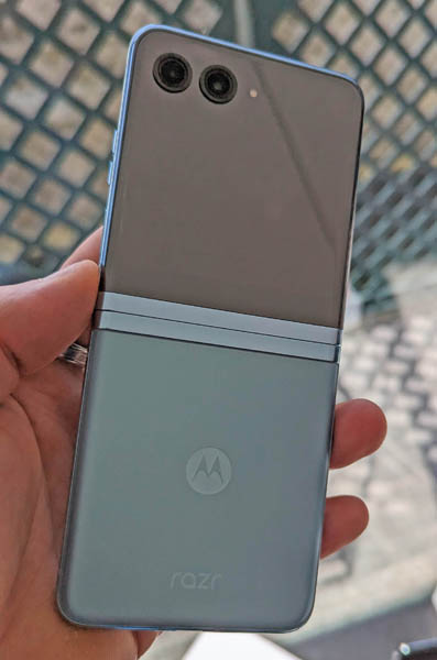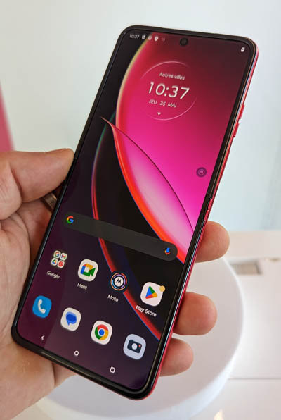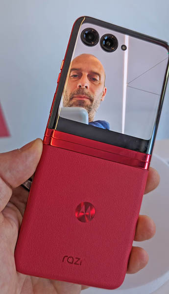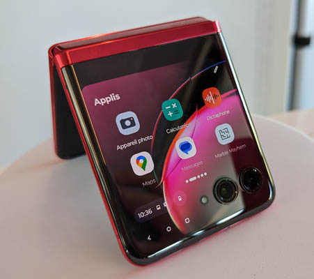 En fait, l’écran fait 3,6 pouces en diagonale, donc plus grand que celui du Oppo Find N2 Flip qui fait 3,26 pouces et encore plus que celui du Samsung qui fait 1,9 pouce. Il intègre les deux capteurs ainsi que le flash. Les coins sont arrondis et l’affichage se fond parfaitement avec le reste du design. Motorola a prévu l’affichage de plusieurs applications sous la forme de widget.