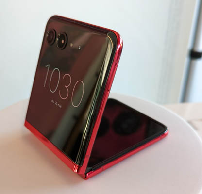 Ouvert à 90 degrés, le mobile, l’écran interne tourné vers soi, cette fois, permet de lire une vidéo sur la partie supérieure tandis que la partie inférieure permet d’afficher les éléments de contrôle. C’est très pratique, mais cela ne fonctionne pas (encore) avec toutes les applications de contenus.