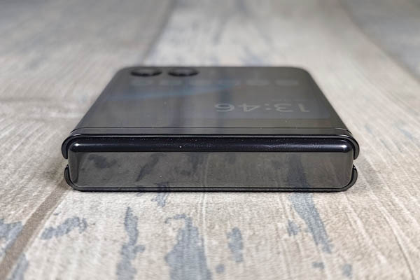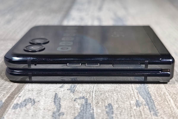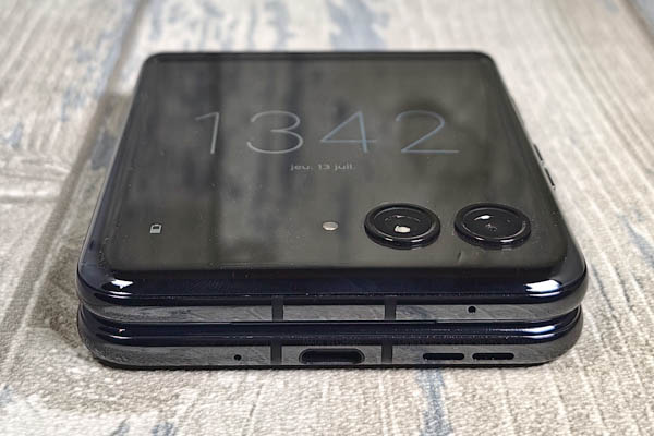 Totalement ouvert, le mobile est assez fin : 6,99 mm contre 6,9 mm pour le Galaxy Z Flip5 et 7,2 mm pour le P50 Pocket de Huawei. Le lecteur d’empreinte digitale est installé sur le profil droit et le volet supérieur. Juste au-dessus, il y a deux petits boutons pour gérer le volume. Ceux-ci ne sont pas très grands et pas toujours évidents à deviner. Il y a aussi un microphone sur ce profil, comme sur le profil supérieur. Le tiroir à carte SIM est situé sur le profil gauche. Il peut accueillir seulement une carte SIM. Si vous en voulez une autre, il faut passer par la technologie eSIM avec laquelle le smartphone est compatible. Enfin, sur le profil inférieur, il y a le connecteur USB-C ainsi qu’un haut-parleur et un troisième microphone.
