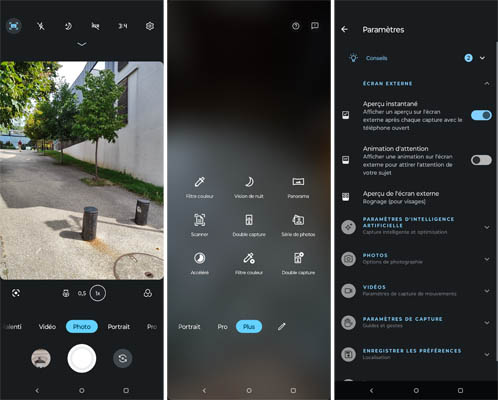 Dessous, il y a les modes Ralenti, Vidéo, Photo, Portrait, Pro et Plus. Dans ce dernier menu, on trouve d’autres modes : Filtre couleur, vision de nuit, panorama, scanner, double capture, série de photos, Accéléré, Filtre couleur (pour les vidéos) et double capture (pour les vidéos). Notez la possibilité de personnaliser la barre des modes en y ajoutant l’un de ceux présents dans le menu Plus, afin d’y accéder plus rapidement.