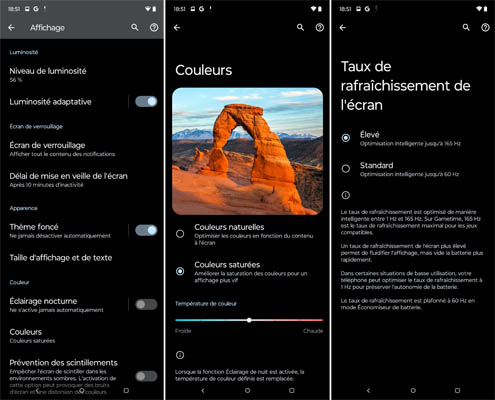L’écran est d’excellente qualité avec une colorimétrie très juste et une luminosité qui peut s’avérer assez forte pour un usage en plein soleil et peut descendre pour ne pas fatiguer les yeux dans la pénombre. Il n’embarque pas autant de technologie de limitation de la fatigue oculaire que le Honor Magic5 Pro, mais il est tout de même très intéressant. Dans les paramètres, on peut choisir entre des couleurs naturelles ou saturées, selon les envies et jouer sur la température de couleur pour obtenir une teinte plus froide ou plus chaude. Une fonction permet de prévenir les scintillements, le cas échéant. Concernant la fréquence de rafraîchissement, il est possible de sélectionner le mode le plus adapté à votre utilisation. Dans ce dernier cas, le système ajuste automatiquement la meilleure fréquence entre 1 et 165 Hz pour trouver le meilleur compromis entre fluidité et consommation de la batterie. Rappelons qu’une fréquence élevée consomme plus d’énergie et donc réduit l’autonomie de l’appareil. À contrario, si la fréquence est faible, l’autonomie est plus importante.