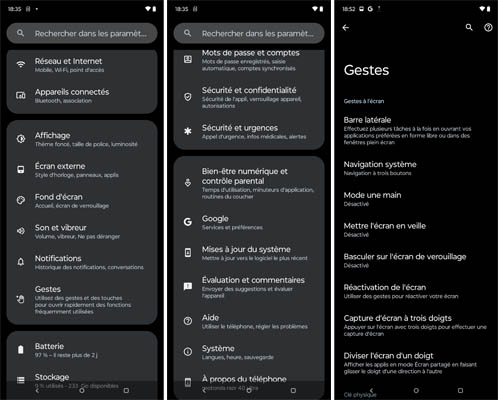 L’interface est bien entendu manipulable avec les gestes. Les options sont nombreuses et pertinentes. On apprécie également les possibilités de sécurité et de confidentialité, mais aussi ceux relatifs aux cas d’urgence, de bien-être numérique et de contrôle parental. Le gestionnaire d’applications se présente sous son format le plus simple. On peut seulement faire une capture d’écran ou fermer toutes les applications en cours d’exécution. Le système est extrêmement fluide. Toutefois, il convient de noter que lors de la première configuration de l’appareil, comme sur le edge40 Pro, il y a de nombreuses mises à jour à faire. Cela prend au bas mot une heure avant de pouvoir pleinement utiliser le mobile avec les mises à jour toutes faites. Comptez sur une occupation d’environ 27 Go pour le système sur les 256 Go de mémoire interne contenus sur notre modèle de tests.