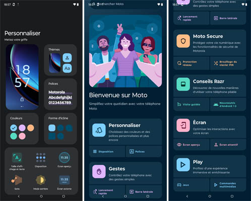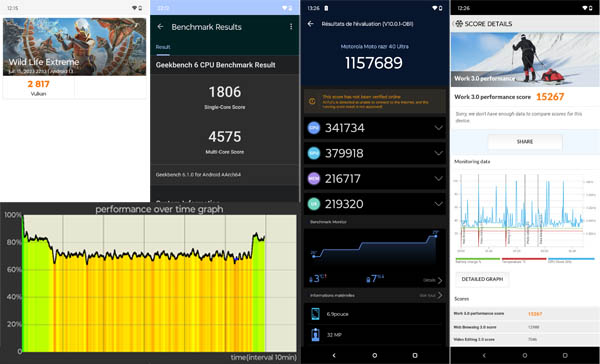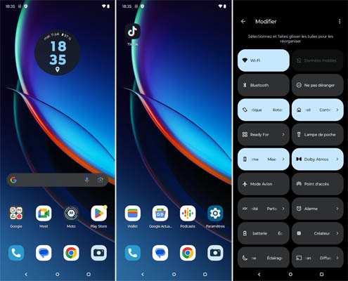 Comme le Motorola edge40 Pro, le Razr 40 Ultra est animé par Android 13 avec une surcouche logicielle développée par Motorola et que l’on trouve également sur les autres mobiles de la marque, dont le Motorola g53, par exemple. Il s’agit d’une interface similaire à Android Stock, c’est-à-dire comme les mobiles Google Pixel. Toutes les applications du géant américain y sont disponibles. En plus, il y a l’application Astro Adyssey, Booking, CQATest, Facebook, Family Space, Moto, Spotify et TikTok. On peut compter sur la fonction Connect For qui permet de s’interfacer à un moniteur pour profiter d’une interface graphique adaptée pour travailler plus efficacement. Les options de personnalisation sont très nombreuses. La mise à jour de sécurité datait du 1er juillet 2023, ce qui très récent, le test s’étant déroulé courant juillet. La mise à jour du système Google Play datait du 1er juillet 2023. Motorola promet 3 ans de mises à jour Android et 4 ans de mises à jour de sécurité, ce qui laisse de quoi voir venir.