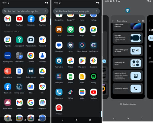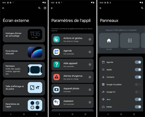 L’écran externe dispose de son propre menu pour la personnalisation. On peut changer l’apparence de l’horloge, le fond d’écran, les widgets qui sont affichés pour en masquer d’autres, ainsi que la taille d’affichage et la police de caractère. On peut choisir d’afficher l’aperçu en direct de la photo ou de la vidéo qu’on est en train de prendre ainsi que de définir certains paramètres relatifs aux appels téléphoniques comme la possibilité (ou non) d’ouvrir le téléphone pour répondre ou de poursuivre l’appel même après la fermeture de l’appareil.