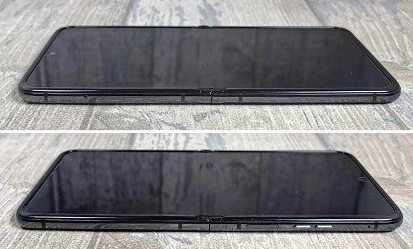 Le pli du milieu ne se voit pas lorsqu’on est de face avec un fond coloré. Il est plus visible lorsqu’on regarde le mobile de côté ou que le fond est clair. On y prête (un peu) attention au début, mais après quelques minutes, on l’a oublié. Au toucher, en passant le doigt dessus, on ne sent quasiment rien.