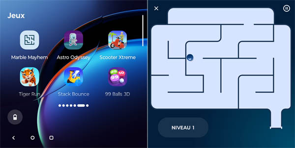 Le Motorola Razr 40 Ultra embarque le plus grand écran externe pour un modèle à clapet. Il fait 3,6 pouces en diagonale et occupe toute la surface supérieure de l’appareil. Il s’agit d’une dalle AMOLED, soit ce qui se fait de mieux aujourd’hui. Il englobe les deux capteurs photo. Rappelons qu’il bénéficie d’une définition de 1056x1066 pixels. L’écran est particulièrement réflecteur et peut parfois jouer le rôle volontaire ou non d’un vrai miroir. Parfois, surtout en pleine lumière, on peut être un peu gêné pour la lisibilité. Toutefois, la luminosité est assez importante, ce qui permet de l’utiliser quand même au quotidien. Rare, cet écran profite d’une fréquence de rafraîchissement de 144 Hz, ce qui est extrêmement élevé pour une telle diagonale. Les couleurs sont relativement fidèles. Motorola a promis de faire le maximum pour que de plus en plus d’applications soient compatibles avec cet écran afin d’avoir des interactions les plus pertinentes possibles, sans avoir à ouvrir l’appareil. Sans développement particulier, les applications peuvent toutefois s’y afficher, mais seulement sur la partie haute, sans intégrer les capteurs photo. Dans le cas d’un développement pour cet écran, l’affichage est total, du haut jusqu’en bas, englobant les capteurs. Spotify, par exemple, a été développé en ce sens. Motorola a d’ailleurs fait développer quelques jeux qui se servent de ces éléments dans le jeu comme le labyrinthe où il faut faire tomber la bille dans l’un des trous virtuels représentés par un capteur.