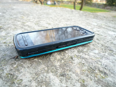 Outre ce liseré, les flancs du 5800 sont passablement encombrés de boutons. C'est du moins vrai pour le côté droit qui propose les traditionnels boutons pour augmenter / diminuer le volume, un bouton poussoir pour verrouiller le clavier (sur lequel nous revindrons plus loin) et la touche de déclenchement de la fonction photo.