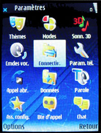 Thèmes, Modes, Sonn.3D, Commandes Voc, Connectiv, Param. Tél, Appel abr., Données, Parole, Ass.config, Bte d'appel, Chat.