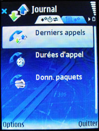 L'onglet « derniers appels » permet d'accéder au classique sous-menu proposant de consulter les appels émis, reçus et en absence. En appuyant sur la touche droite du pavé directionnel de ce menu, on accède à un journal affichant tous les appels sur la même page.