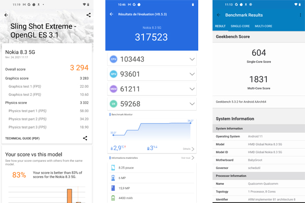 En fait, s'il fait effectivement figure de flagship pour la marque Nokia, lorsqu'on regarde ses caractéristiques et la concurrence, notamment chinoise, on se rend compte qu'il est équipé des composants de milieu de gamme et pas plus. Son écran déjà dont nous avons parlé précédemment. Ensuite sa plateforme qui est composée d'une puce Qualcomm Snapdragon 765G, clairement de milieu de gamme, associée à 8 Go de mémoire vive. C'est le même processeur que l'on trouve par exemple dans le Oppo Find X2 Neo, le Oppo Reno4 Pro ou le Vivo X51 5G. Même si l'appareil date de la fin de l'année 2020, le Snapdragon 865 est plus puissant (mais aussi plus cher). HMD Global a certainement souhaité réduire les coûts afin de proposer un smartphone abordable. Le souci est que les performances sont effectivement moindres que celles que nous aurions pu attendre par rapport à son positionnement. Les applications sont correctement exécutées, sans ralentissement, mais bizarrement, dans les jeux, nous avons eu droit à quelques saccades et un niveau de détails que l'on ne peut pas atteindre sans avoir la dernière puce intégrée. Nous avons soumis le mobile à plusieurs outils de mesure afin de pouvoir les comparer aux scores des autres smartphones testés précédemment.