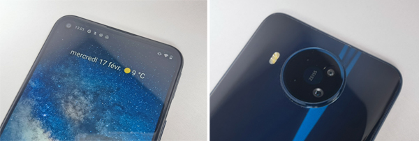 L?écran vient se poser dessus avec des bords là encore légèrement incurvés (2.5D) rejoignent le cadre. On peut souligner la très bonne qualité de finition. Le mobile est équilibré. En main, il ne tombe pas d'un côté ou de l'autre. Revenons au dos pour remarquer le bloc optique photo en position centrale en haut. Il dépasse assez sérieusement du reste de la surface arrière. Une fois la coque fournie par le constructeur enfilée, il est sur le même plan. Le cercle qui inscrit les 4 capteurs est souligné par un liseré bleu, dans le même ton que les reflets de la lumière qui se pose sur le dos du mobile. Le centre profite également de cette couleur et de l'inscription de la marque du partenaire photo : Zeiss. Assez bizarrement, les marques Zeiss et Nokia (au milieu du dos) sont écrites dans le sens vertical alors que la plupart du temps, on tient son mobile dans ce sens sauf? lorsqu'on prend une photo en mode paysage. C'est peut-être comme cela que les deux marques souhaitent être le plus remarquées ?
