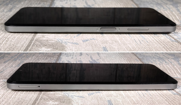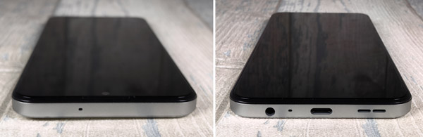 Le châssis du smartphone est en plastique (60% est issu du recyclage), laissant passer les ondes pour la connexion aux réseaux de télécommunication. Sur le profil de droite, il y a le bouton de mise en veille qui sert également de lecteur d’empreinte digitale. Celui-ci est installé au sein d’un petit creux comme pour mieux le distinguer avec le pouce qui est appelé à se poser dessus pour reconnaître l’empreinte. C’est original et inédit permettant au bouton de ne pas dépasser. Par contre, la double touche pour gérer le volume, situé juste au-dessus, dépasse. Sur le profil supérieur, il y a un microphone. Le tiroir à cartes SIM est installé sur le profil de gauche. Celui-ci peut accueillir soit deux cartes SIM simultanément, soit une carte SIM et une carte mémoire au format micro SD. Enfin, sur le profil inférieur, on trouve le connecteur USB-C, celui pour brancher un casque, un microphone et un haut-parleur. Le son délivré par le smartphone est de type mono. Il est correct pour les sons de l’appareil, mais il ne suffit pas pour profiter d’une série, par exemple. L’écoute au casque donne des résultats bien meilleurs qu’avec le haut-parleur. Le lecteur d’empreinte digitale nous a donné pleinement satisfaction, car il a toujours refusé d’autres doigts que ceux de nos testeurs. Sa réactivité est correcte, déverrouillant le mobile assez rapidement.