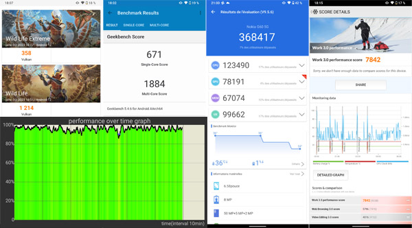 Afin d’évaluer les performances brutes du Nokia G60 5G (4+128 Go dans notre cas), nous l’avons soumis à plusieurs outils de mesure et dont voici les principaux résultats. Le smartphone se montre particulièrement régulier dans ses performances, comme on peut le voir sur le graphique de la capture de l’application CPU Throttling, délivrant presque tout son potentiel jusqu’à la fin du test, une belle prouesse dont ne sont pas capables toutes les puces de nos smartphones, loin de là. Le mobile reste tempéré, ce qui signifie qu’il ne chauffe pas, même soumis à rude épreuve.