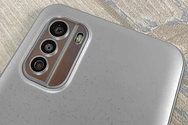 L’appareil est décliné en noir ou en gris, selon la version choisie. Dans le coin supérieur à gauche, le bloc de capteurs est installé sur une petite plaque de la même couleur que le reste du dos. Les trois capteurs sont alignés verticalement et, à côté, il y a le flash LED avec une mention 50 MP AI Camera comme pour indiquer le nombre de pixels du capteur principal, mais également l’utilisation de l’intelligence artificielle pour optimiser les clichés.