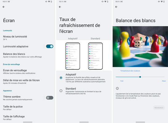 Le Honor Magic4 Lite 5G a aussi un écran LCD, plus grand, sur 6,81 pouces, avec du 120 Hz, comme le realme 9 5G sur 6,5 pouces et comme le OnePlus Nord CE 2 Lite 5G sur 6,59 pouces. Les autres concurrents cités précédemment bénéficient d’un écran AMOLED avec du 120 Hz pour le Redmi Note 11 Pro 5G, le Poco X4 Pro et le Motorola edge30 Neo alors que les autres sont limités à 60 Hz pour les Sony Xperia 10 IV, Oppo Reno8 Lite et 90 Hz pour le Nokia X30 5G. Dans les paramètres du Nokia G60 5G, il est possible de bloquer la fréquence sur 60 Hz pour limiter la consommation d’énergie ou rester continuellement en 120 Hz, au profit de la fluidité, mais au détriment de l’autonomie. Le mobile ne fait pas varier automatiquement la fréquence. L’écran LCD propose une teinte moins flatteuse qu’avec une dalle AMOLED dont les couleurs sont plus vives. Ici, on peut jouer sur la température des couleurs pour obtenir un rendu plus ou moins chaud dans le menu Balance des blancs.