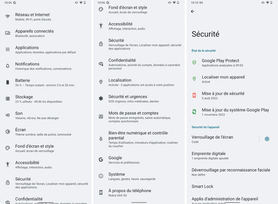 Le smartphone Nokia G60 5G fonctionne sous Android 12. Il s’agit, une nouvelle fois, comme pour les autres mobiles de la marque, de proposer une interface qui soit la plus pure possible. Celle-ci peut aisément être comparée à celle que l’on trouve sur les smartphones de Google. Sur notre modèle de test, la mise à jour du Google Play datait du 1er novembre 2022 (pour un test réalisé fin janvier 2023), ce qui peut satisfaire, mais la mise à jour de sécurité datait du 5 aout 2022, ce qui, pour le coup, en un peu trop ancien. Nokia promet 3 ans de mises à jour d’Android et 3 ans de mises à jour de sécurité « mensuelles »… Espérons que la marque rattrape donc son retard sur la mise à jour de sécurité dans les prochaines semaines.