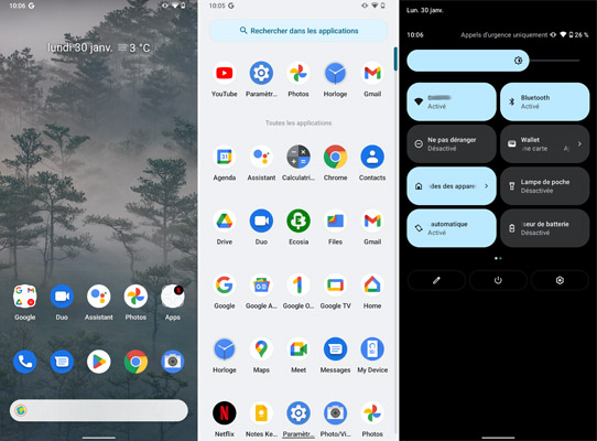 La surcouche logicielle est donc extrêmement légère sur ce smartphone. Il y a principalement les applications Google installées dessus avec, en plus Ecosia, le moteur de recherche écologique, Boutique Amazon, ExpressVPN, LindekIn, Spotify et Netflix. Comme pour les autres smartphones, même d’autres marques, l’utilisateur peut ainsi choisir le moteur de recherche qu’il souhaite utiliser. La navigation par gestes est possible. La barre des notifications et des fonctions de raccourcis est identique à celle des mobiles Google avec des possibilités d’interaction. Le gestionnaire d’applications permet de passer de l’une à l’autre, mais sans aucune autre option comme cela est proposé sur les mobiles Xiaomi, par exemple. Les paramètres sont classiques. Il n’y a pas de fonctions spéciales comme la possibilité de scinder l’écran en deux ou de permettre l’affichage de fenêtres volantes ou d’une barre latérale, par exemple. Les personnes qui aiment cette interface épurée seront donc ravies alors que ceux qui préfèrent avoir des suggestions et des options de personnalisation plus poussées resteront sur leur faim.