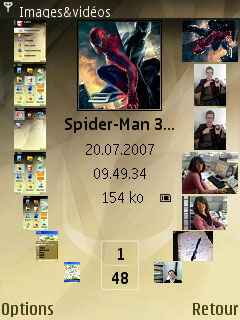 Passons maintenant à la lecture des vidéos. C'est toujours Real Player dès que vous en lancez une. Le logiciel fonctionne parfaitement et permet d'avancer sans encombre dans n'importe quelle vidéo. Le N95 8Go lit nativement les formats Mp4 et 3GP mais, Symbian oblige, vous pouvez installer un lecteur DivX bien pratique puisque ce format est sans conteste le plus populaire. Le point fort est que vous n'avez plus à ré-encoder vos vidéos, juste à la mettre dans le téléphone ! Le rendu est très bon malgré l'écran de taille relativement réduite. Nokia propose le film Spiderman 3 en entier directement chargé dans la mémoire du mobile. La qualité est vraiment bluffante mais regarder un long métrage de plus de deux heures sur un écran de 7 centimètres de diagonale peut s'avérer fatiguant pour les yeux. Les séquences vidéos plus courtes telles que les clips, les émissions télé ou même les séries passent beaucoup mieux.